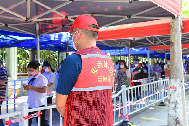 在湖里區興華社區核酸檢測點,黨旗紅、志愿紅、象嶼紅交相輝映。近30位象嶼集團志愿者頭頂烈日,盡心竭力做好隊伍秩序維護、查驗健康碼等工作,引導市民保持合理間距,安全有序檢測。