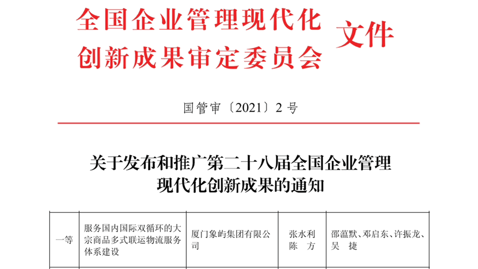 2022年,第二十八屆全國企業管理現代化創新成果名單發布,象嶼集團憑借《服務國內國際雙循環的大宗商品多式聯運物流服務》榮獲一等獎,成為廈門首家獲評該獎項一等獎的企業。11月,倫敦設計獎(London Design Awards)結果出爐,上海天安象嶼西江悅榮獲建筑設計類別最高獎金獎,福州象嶼國貿星璟原獲展示空間銀獎。此外,2020-2021年度全國企業文化優秀成果一等獎、2022金蜜蜂企業社會責任·中國榜“ESG競爭力·責任采購”獎、福建五一勞動獎狀、福建省優秀企業家等重磅獎項也先后花落象嶼,凸顯社會對象嶼的高度認可。
