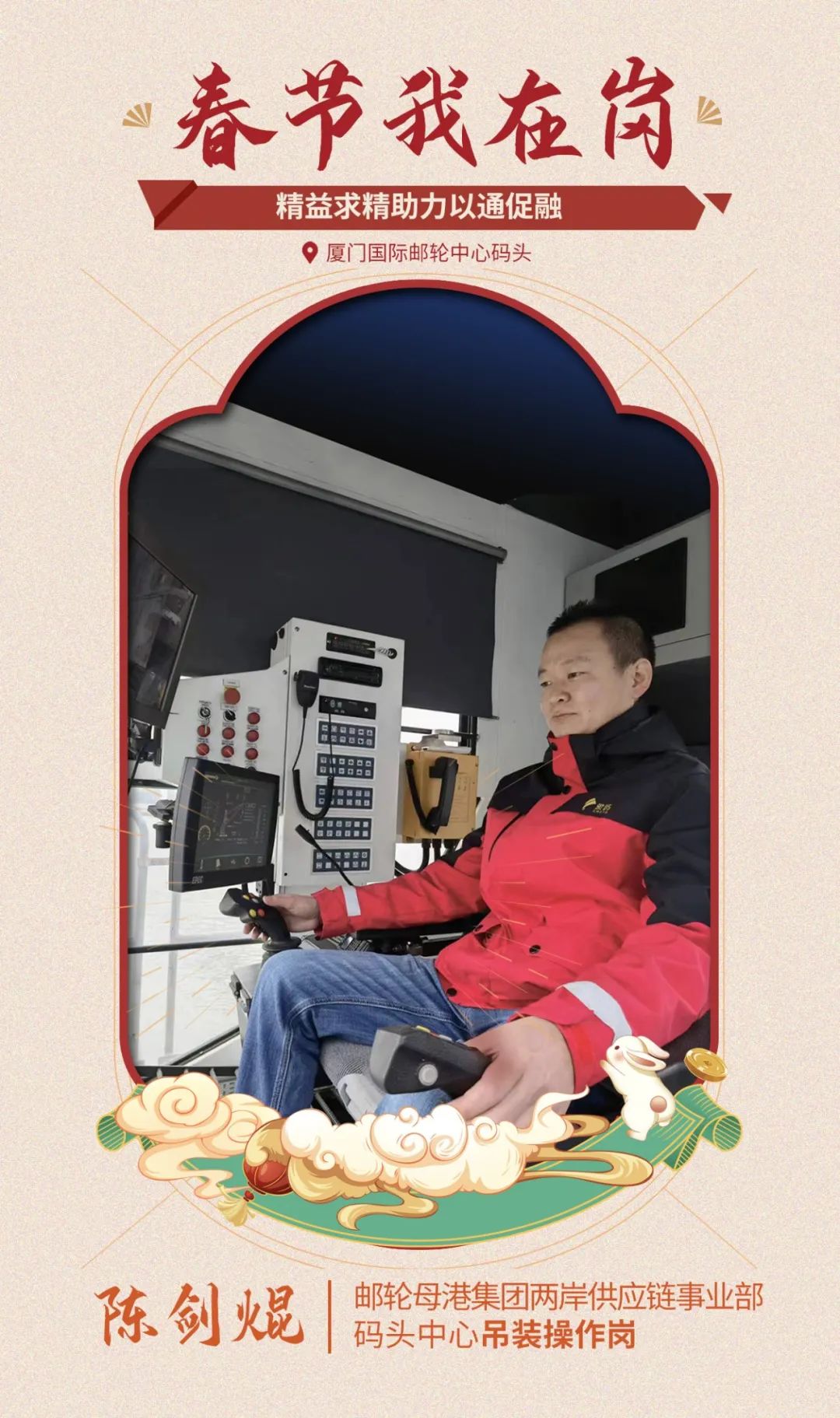 春節期間兩岸貨運航線持續通航,陳劍焜堅守崗位,操作流動式起重機吊裝貨柜,以飽滿的工作熱情,保障兩岸間水路貨運業務正常運轉,助力兩岸融合發展。