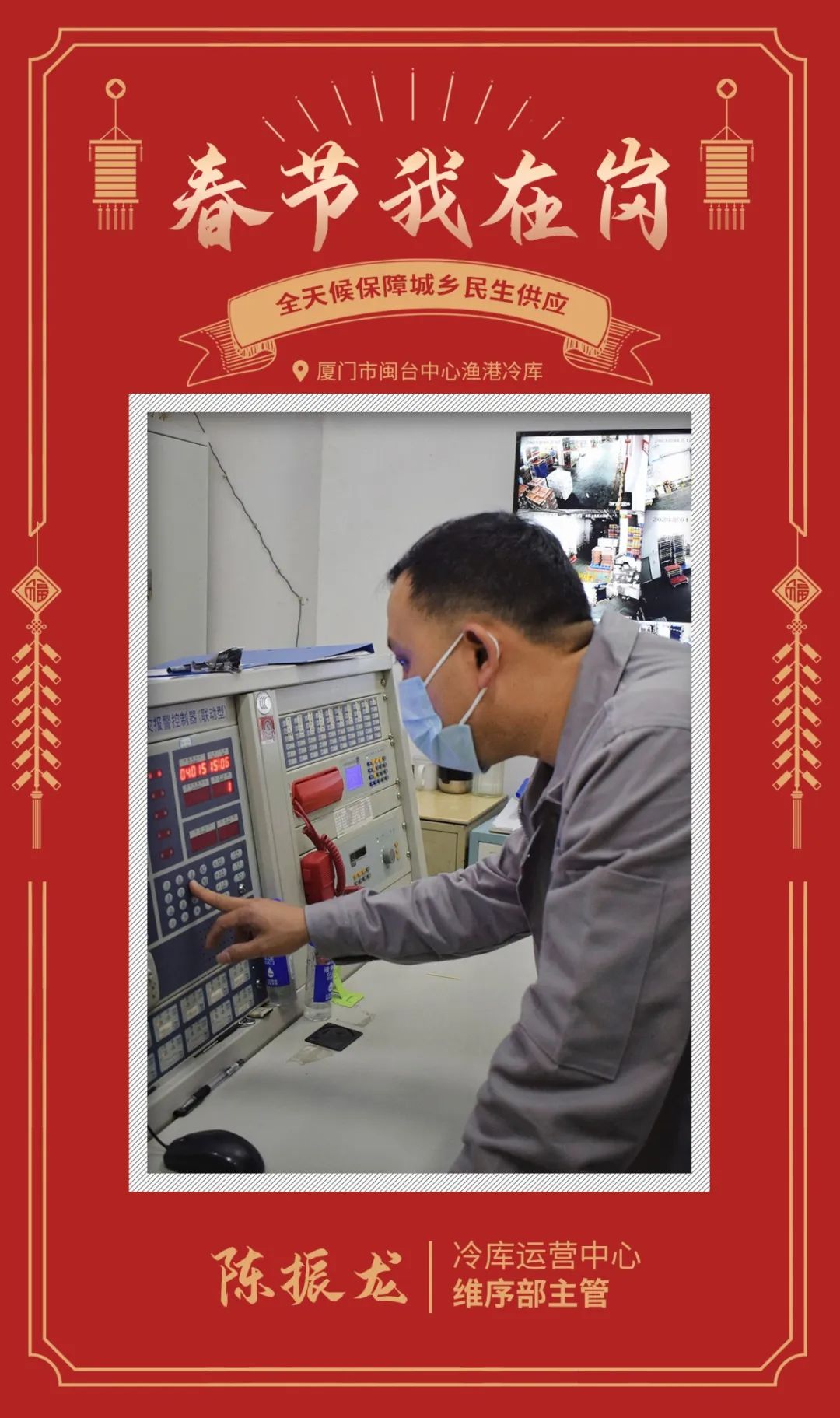 閩臺中心漁港冷庫(含超低溫冷庫)項目為廈門市商務局“城鄉民生基礎設施”,并于2020年納入市重點物流項目,需要全年24小時全天候執勤。春節期間,陳振龍堅守崗位一線,確保冷庫運營中心消防系統、電系統設施設備安全運行,協調包庫客戶合理分配裝卸平臺,做好提、送貨車輛調度,為城鄉民生供應鏈提供保障。
