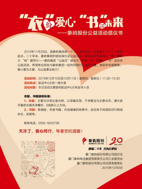 鷺島雖已降溫,善行卻讓人溫暖無比。集團倡導(dǎo)開展“象嶼公益日”活動,旨在讓愛在每位象嶼人的心間徜徉,成為長期的堅守和正能量;也希望能讓象嶼在社會發(fā)光,與社會各界一道,將公益融入日常的一舉一動。