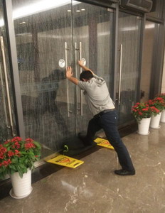 王志富是臺風(fēng)登陸當(dāng)晚象嶼高尚物業(yè)公司留下值守的54位員工中的一個,他負(fù)責(zé)國際航運(yùn)中心D棟的安全。D棟處于風(fēng)口位置。凌晨2點(diǎn)多,風(fēng)大作,雨加急,那聲勢猶如排山倒海,讓這位魁梧的大漢也是心驚。眼看防汛沙袋做的大門加固也無法阻擋風(fēng)雨的侵入,他不顧只身一人,奮力頂住玻璃大門。“一旦雨水灌入大堂,流入電梯井,后果不堪設(shè)想!”聞訊趕來增援的4位值守人員也都撲上來用力頂住大門,五人使足了勁,一個多小時后,風(fēng)力減弱,他們以堅(jiān)定的意志戰(zhàn)勝了狂暴的臺風(fēng),玻璃門沒有倒下,D棟安全了!