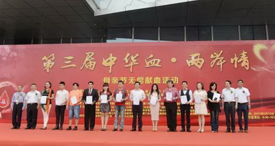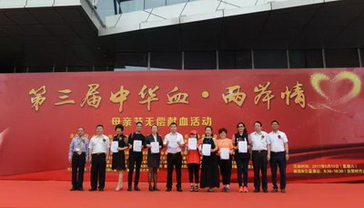 獻血活動開幕式上,在兩岸貴賓、志工們的見證下,連續三屆參與獻血活動的兩岸愛心人士獲頒榮譽。