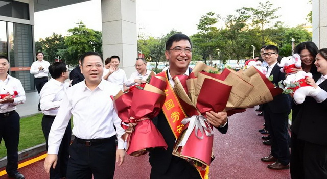 在象嶼集團總部,員工們以鮮花和掌聲熱烈迎接全國勞模的歸來。“向勞模學習,向勞模致敬!”口號此起彼伏,員工們興奮地紛紛搶著與勞模合影,留下珍貴的歷史瞬間。大家還舉起手中的“晨晨”公仔,齊聲祝福“象嶼集團25周年生日快樂!再創新高!”,喊出了弘揚勞模精神、勞動精神、工匠精神,奮進象嶼新征程的決心和信心!