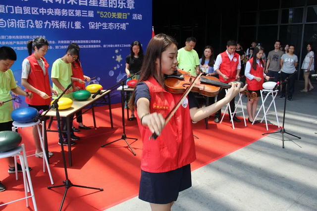 ▲2019年5月,在象嶼集團(tuán)舉辦的關(guān)愛(ài)自閉癥兒童活動(dòng)中,象嶼志愿者與自閉癥兒童一起表演色空鼓。