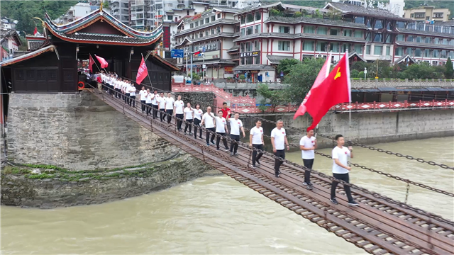 飛奪瀘定橋,是紅軍長征路上的關(guān)鍵一仗,是一場比智慧、比毅力、比勇氣的戰(zhàn)斗。“挑戰(zhàn)之旅”隊伍在黨旗和支線旗的引領(lǐng)下,行進在鐵索橫江的瀘定橋上,一幅幅戰(zhàn)斗畫面在腦海中浮現(xiàn),一聲聲吶喊和槍炮聲猶在耳畔回蕩,激發(fā)起象嶼建設(shè)集團團隊干事創(chuàng)業(yè)、勇于挑戰(zhàn)的工作熱情。