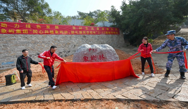▲象嶼集團、駐廈某部隊、廈門外國語學校湖里分校、東榮社區領導共同為象嶼林揭碑。