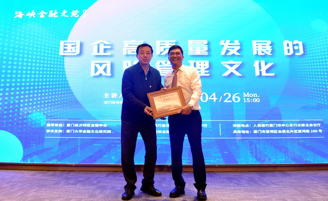 4月26日下午,應廈門經濟特區金融學會的邀請,象嶼集團黨委書記、董事長張水利站上“海峽金融文苑”的講壇,面向全市百余家金融機構負責人,做《國企高質量發展的風險管理文化》專題分享。中國人民銀行廈門市中心支行行長、廈門經濟特區金融學會會長王彥青出席講座,并為張水利董事長頒發感謝狀。本次活動由廈門經濟特區金融學會指導、廈門大學金融文化研究院提供學術支持、中國銀行廈門市分行主辦。中國銀行廈門市分行副行長陳顥主持講座。
