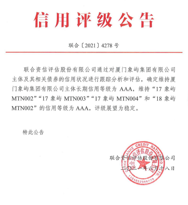 6月21日,國內權威評級機構聯合資信評估股份有限公司(以下簡稱“聯合資信”)發布廈門象嶼集團有限公司(以下簡稱“象嶼集團”)2021年跟蹤評級報告,確定維持象嶼集團主體長期信用等級和公司債券信用等級為AAA,評級展望為穩定。