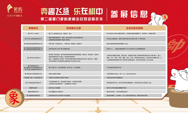 嘉年華現場還設置了象棋主題文化展區,包括當代象棋大師臉譜及象棋文化展、廈門象嶼象棋隊精彩回顧及象嶼品牌、公益主題展等,通過豐富的圖文資料,帶您回顧廈門象嶼象棋隊的精彩瞬間,展示出征象甲“新班底”。