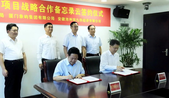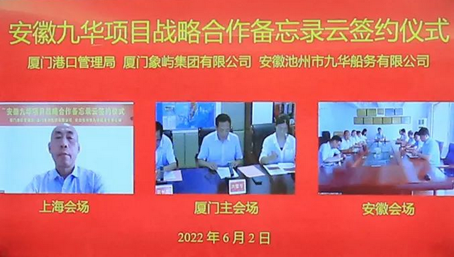 6月2日,象嶼集團與廈門港口管理局、安徽池州市九華船務有限公司“云端”簽署戰略合作備忘錄,三方攜手在船舶建造、運輸經營、船舶融資、要素聚集等領域深挖合作空間,共同推進廈門港口航運事業做大做強,助力廈門港口高質量發展。廈門港口管理局黨組書記、局長夏長文,象嶼集團黨委書記、董事長張水利,安徽九華船務董事長王國年等出席簽約儀式。