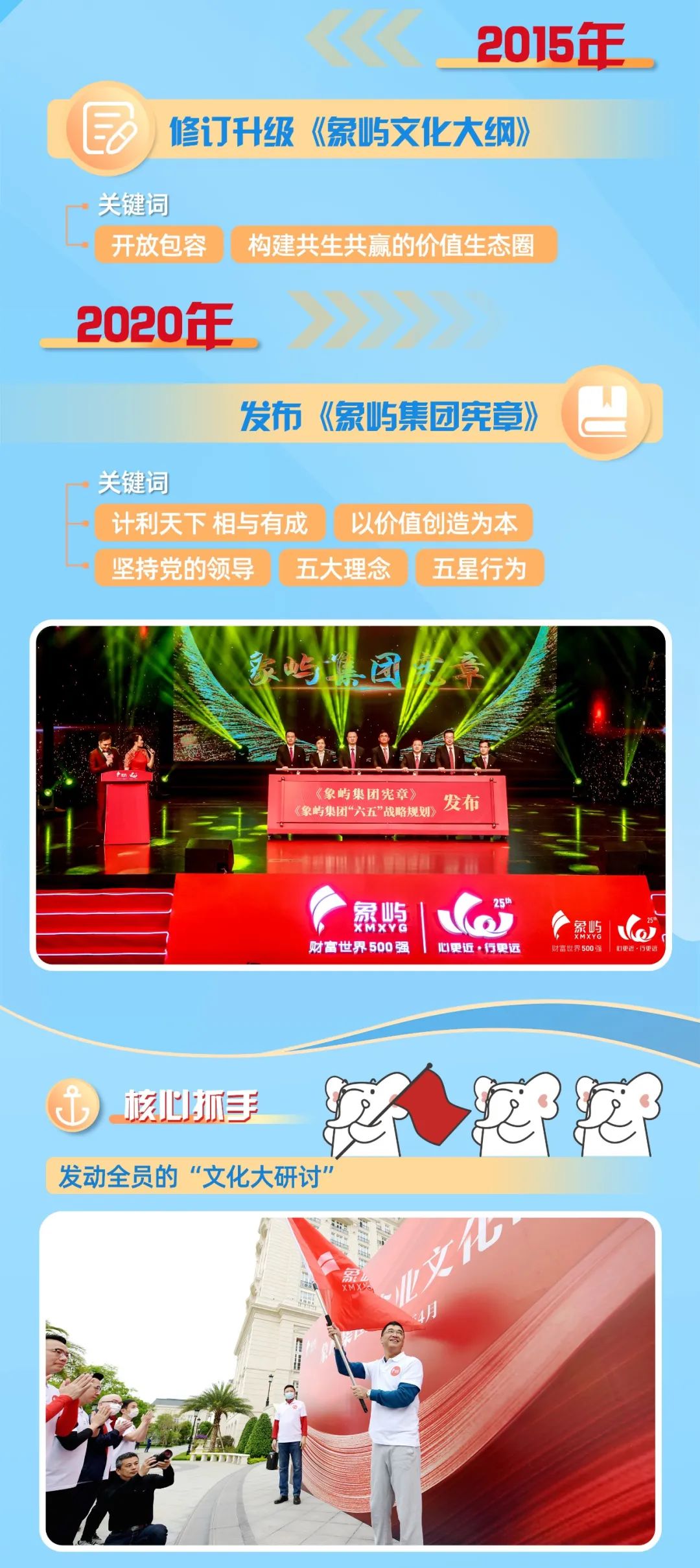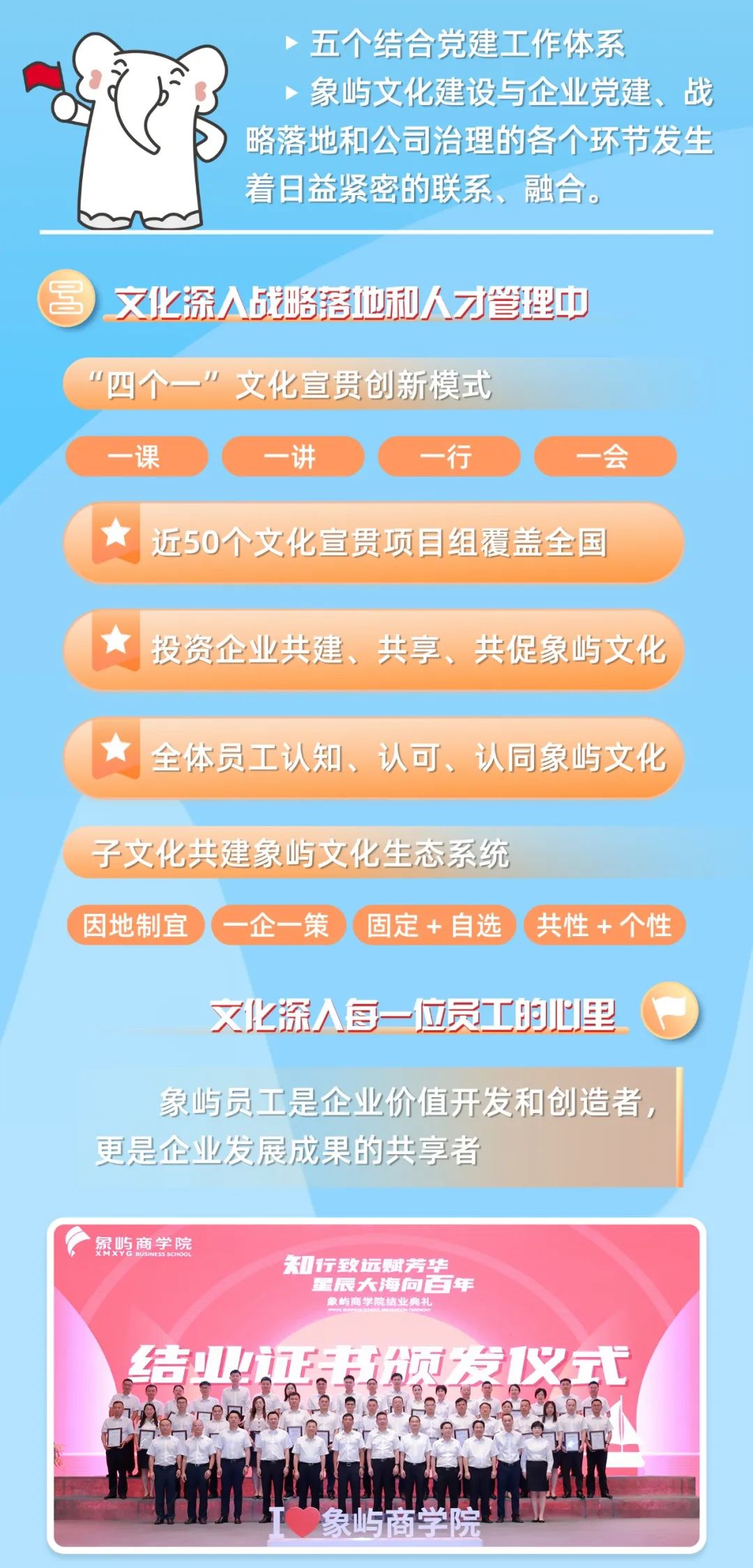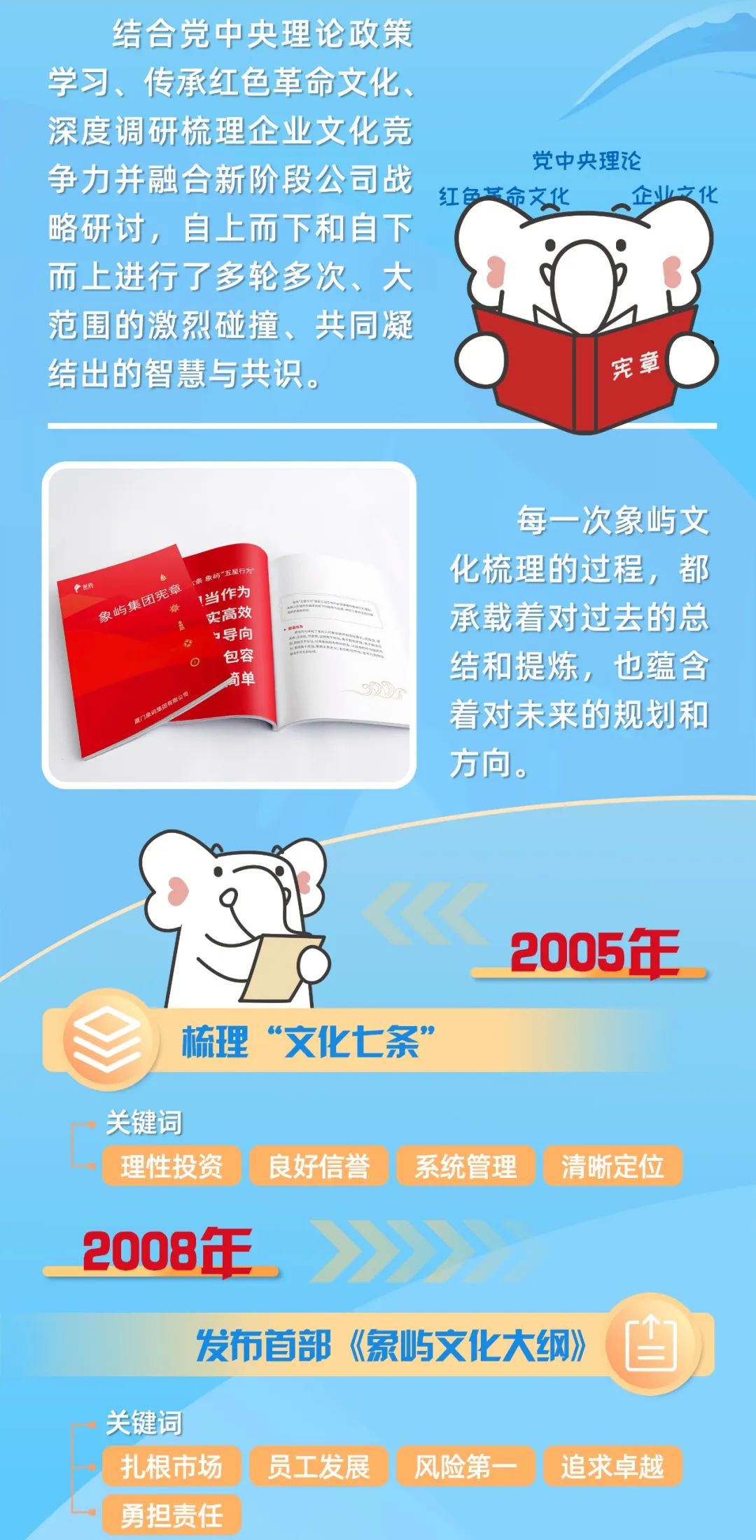 習近平總書記指出:“我們要堅持道路自信、理論自信、制度自信,最根本的還有一個文化自信”“文化自信,是更基礎、更廣泛、更深厚的自信”。27年來,象嶼集團始終堅持黨的領導,以創新開拓的特區精神投身于改革開放和市場經濟的發展浪潮中,歷練出以堅持市場化道路、堅持風險第一等為核心的、蘊含海洋基因的特色企業文化,為企業高質量發展筑牢根基,提供強有力的精神動能。