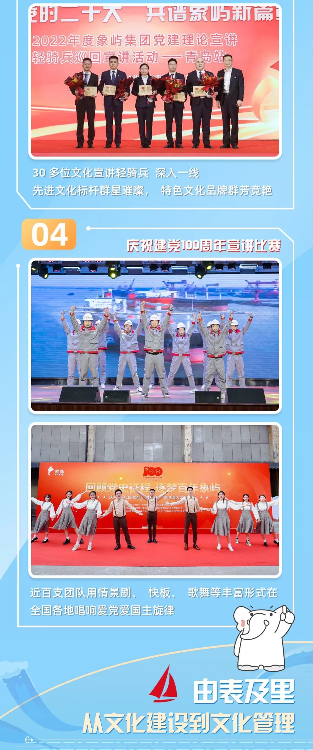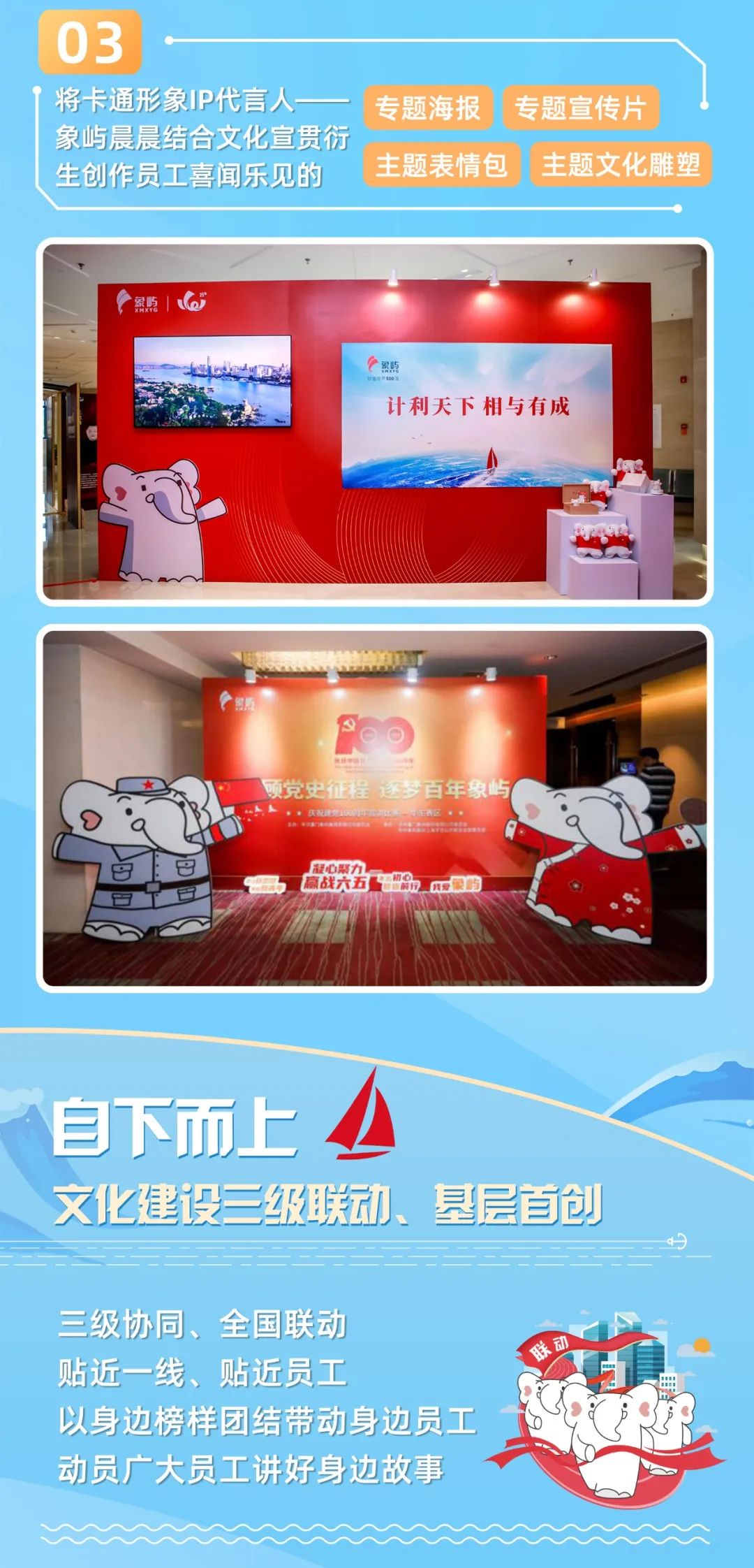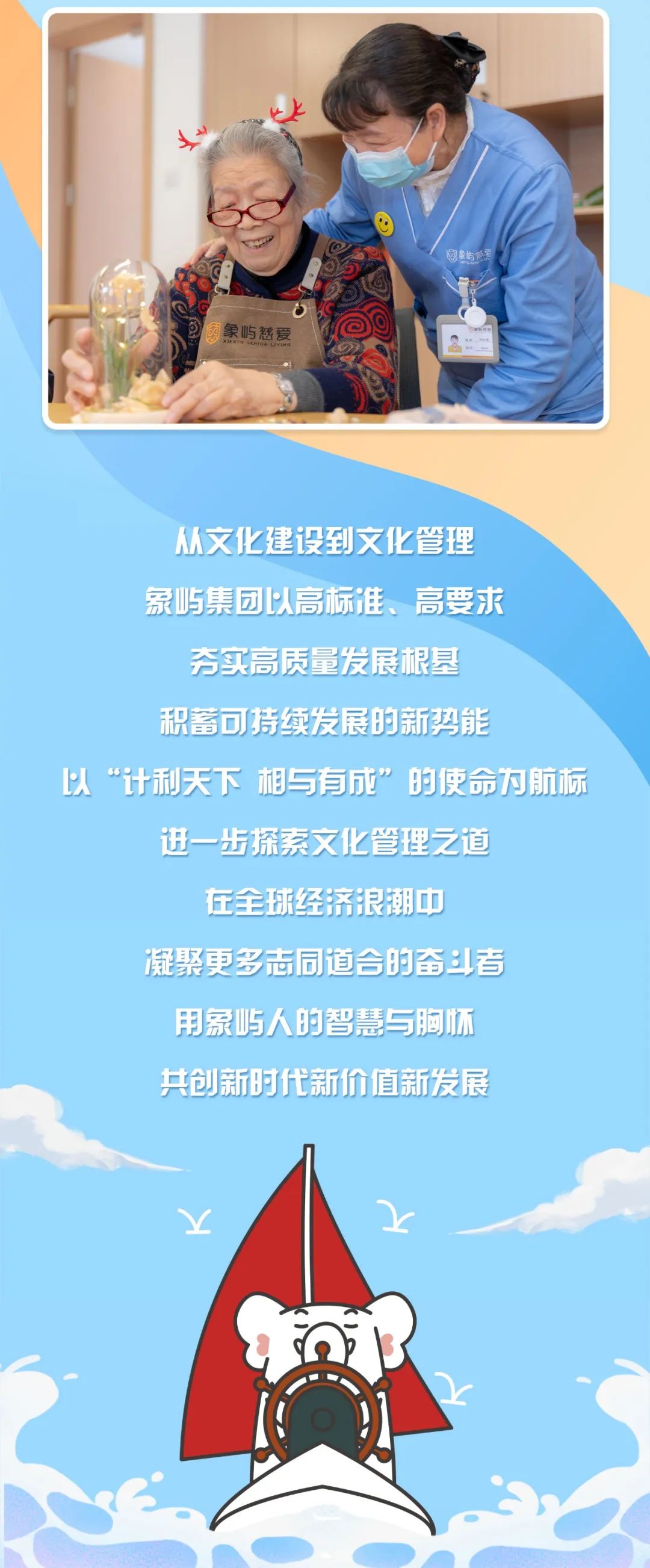 習近平總書記指出:“我們要堅持道路自信、理論自信、制度自信,最根本的還有一個文化自信”“文化自信,是更基礎、更廣泛、更深厚的自信”。27年來,象嶼集團始終堅持黨的領導,以創新開拓的特區精神投身于改革開放和市場經濟的發展浪潮中,歷練出以堅持市場化道路、堅持風險第一等為核心的、蘊含海洋基因的特色企業文化,為企業高質量發展筑牢根基,提供強有力的精神動能。
